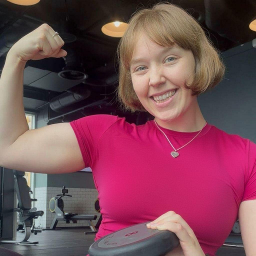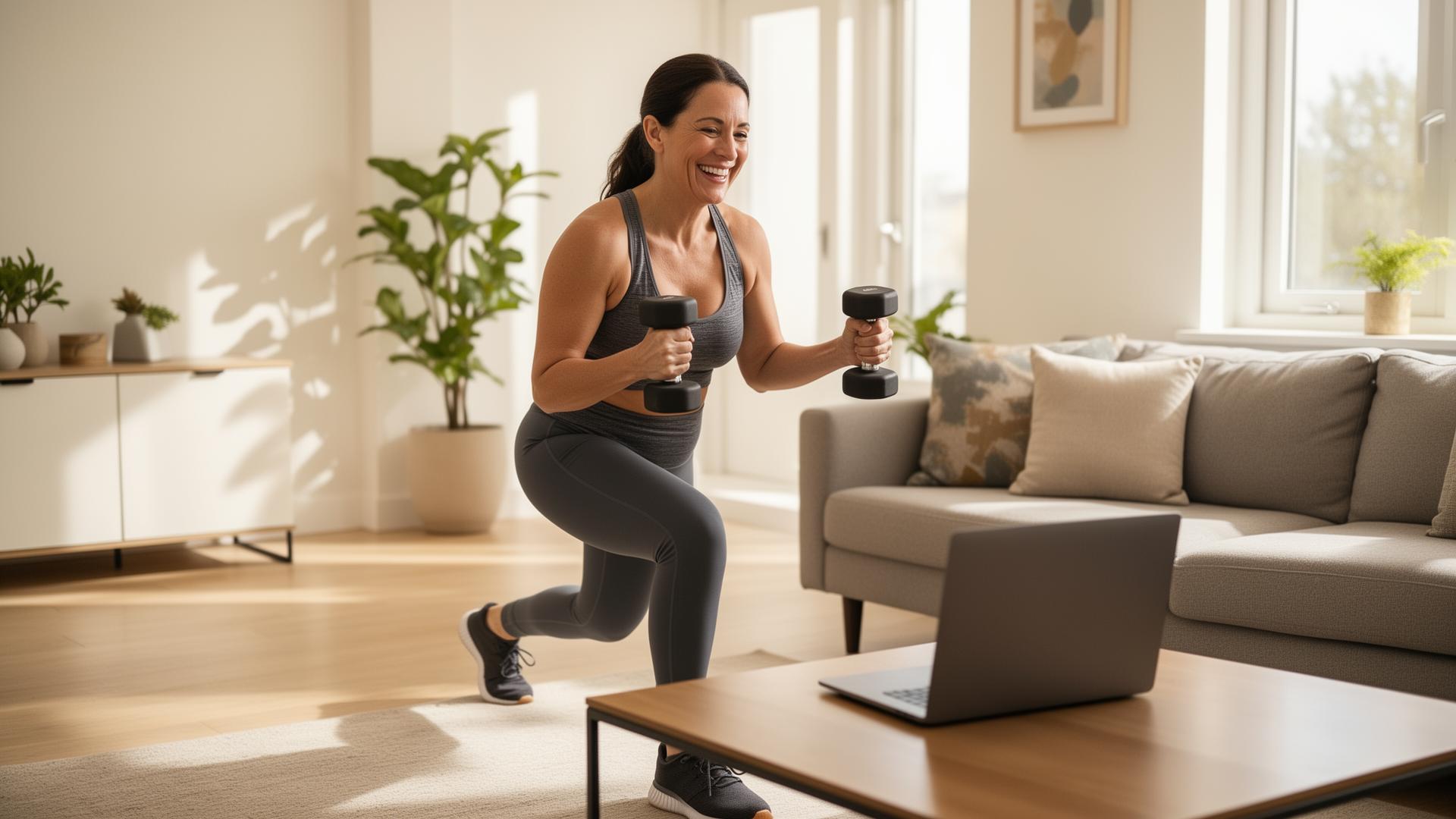 Woman aged 40 doing dumbbell lunges at home watching fitness coach on laptop
